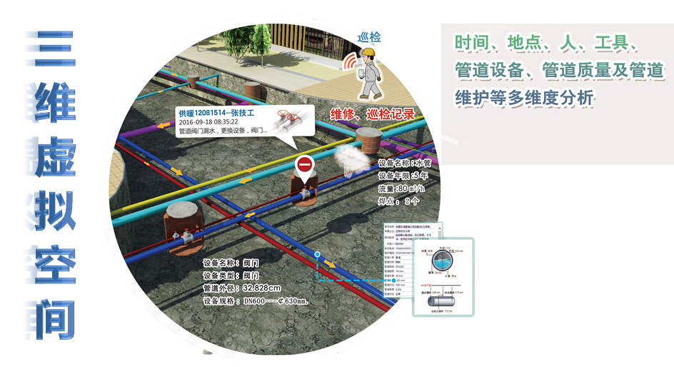 ■ 管道閥門、水流向智能分析:直觀看出管網(wǎng)的各個(gè)閥門、接頭的位置等信息。管道維護(hù),坐標(biāo)點(diǎn)采集,在圓形上顯示位置,可以自動(dòng)判斷出此處受到哪些閥門控制,影響哪些供水。